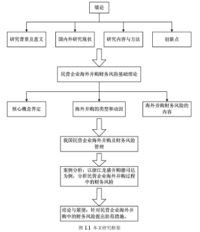 第一部分,绪论。在阐述了论文的研究背景和研究意义之后。在广泛阅读文献的基础上,整理了国内外关于海外并购的文献研究,从而提出自己的研究思路,对论文的框架做了简单的介绍,指出文章创新之处。
